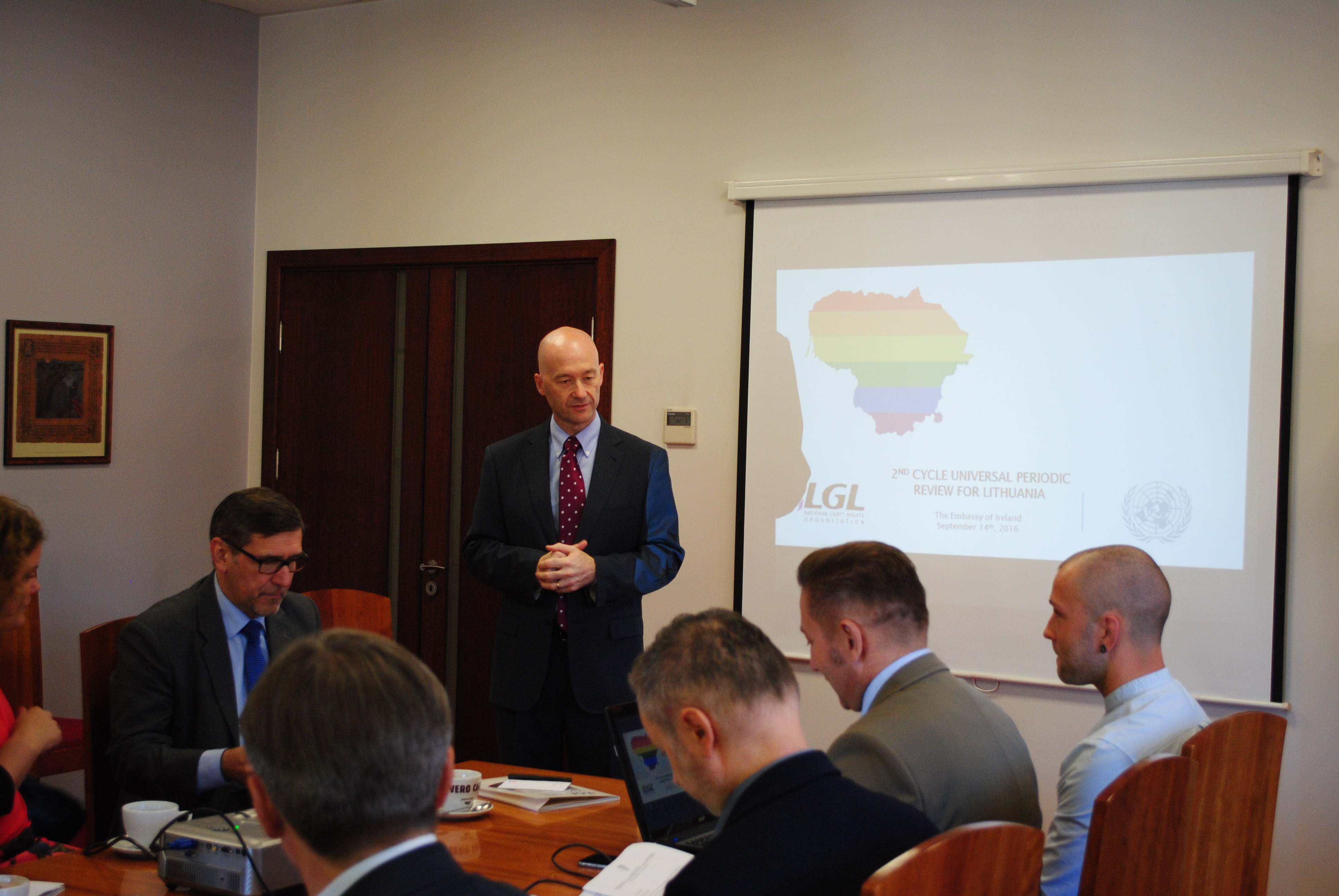 On November 2nd, 2016 Lithuania will be reviewed by the Human Rights Council of the United Nations (UN) within the second cycle of the Universal Periodic Review (UPR). The National LGBT* Rights Organization LGL continues to engage in the process and together with international human rights organizations ILGA-Europe and Sexual Rights Initiative submitted the shadow report to the UPR mechanism on March 21st, 2016. The joint submission outlines the key challenges faced by LGBT* people under the Lithuanian national circumstances. With the aim of exploring further opportunities in raising international awareness on LGBT* human rights situation in Lithuania, LGL invited the Embassies of the foreign countries in Lithuania to join a meeting hosted by the Embassy of Ireland on September 14th, 2016.