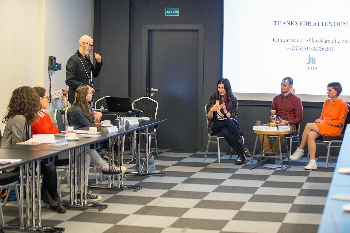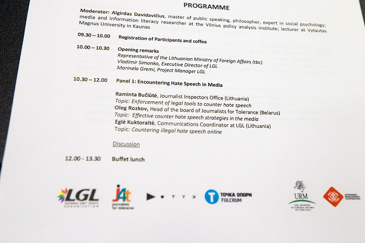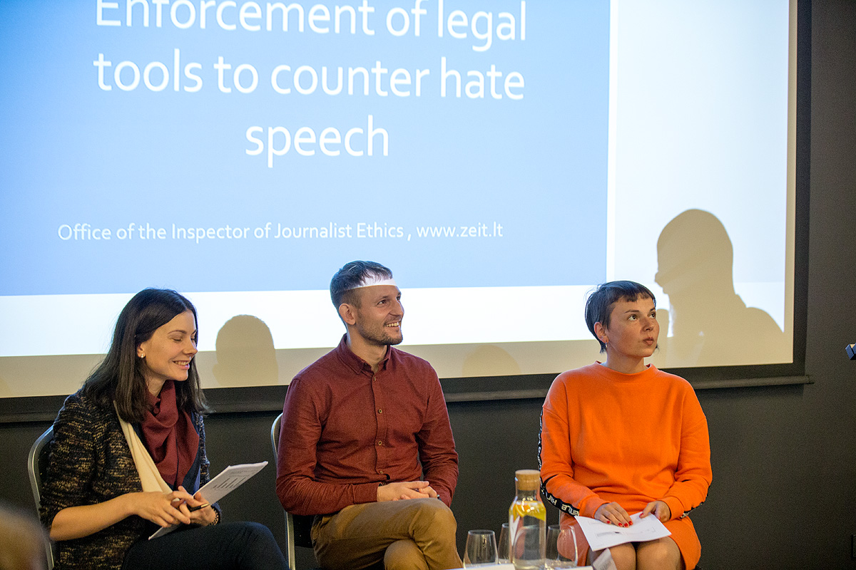 During the first part of the seminar, Raminta Bučiūtė, Chief specialist (law) of the Inspector of Journalist Ethics, Eglė Kuktoraitė, the communications manager at LGL, and Oleg Rozkov, head of the Board at the Journalists for Tolerance in Belarus, presented effective ways of fighting hate speech, false news and propaganda in the media and social networks.