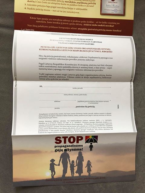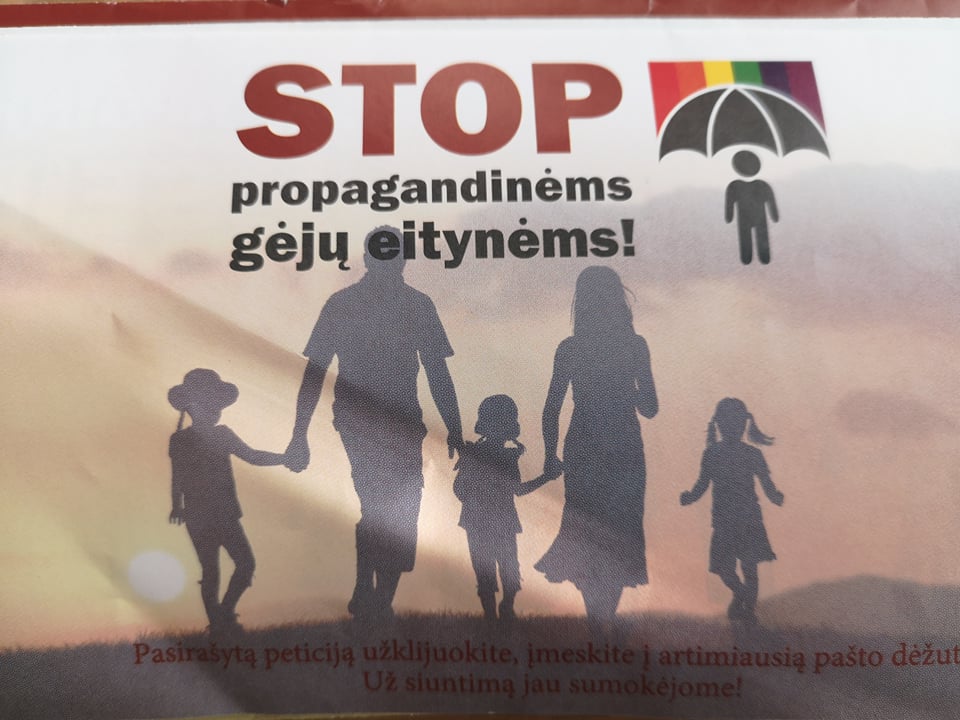 Lithuanian NGO “Christian Culture Institute”, funded by Polish Piotr Skarga fund, started to distribute homophobic leaflets urging to sign a petition to ban the upcoming Baltic Pride march to every single post box in Lithuania. The National LGBT rights organization LGL received the first messages from LGBT community members informing about the leaflets in the beginning of November. In their messages, members of the local LGBT community indicate that the content of the leaflet hurts their feelings and is incompatible with Christian values.