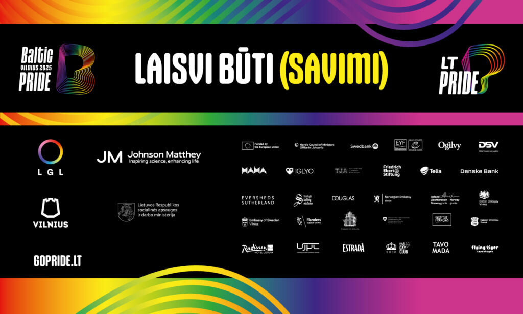 From June 2 to 8, 2025, Vilnius will host the Baltic Pride festival, organized by the National LGBT Rights Organization LGL. Under the slogan “Free to Be (Yourself),” the festival invites the LGBTQ+ community and its allies to come together in a week-long celebration of diversity, unity, and pride. The program includes the community space Pride House, an international conference, a film screening, a theatrical event Pride Voices, a vibrant March for Equality through Gediminas Avenue, and an open-air concert.