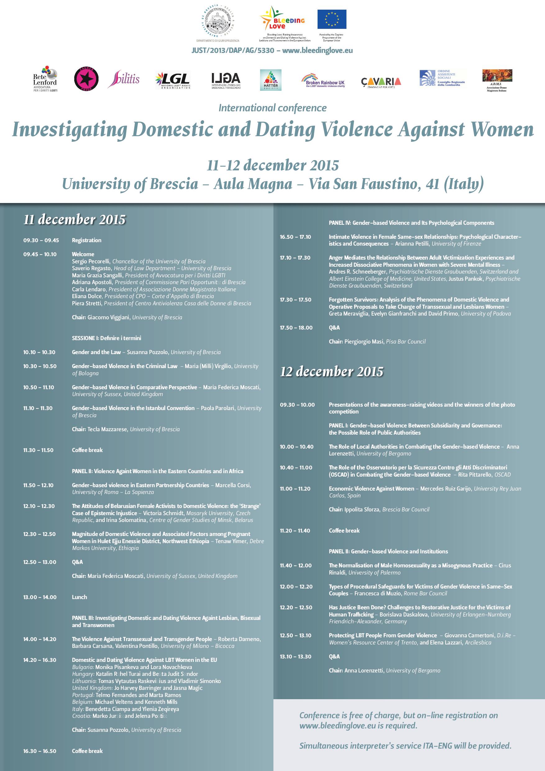 Š.m. gruodžio 11-12 dienomis nacionalinės LGBT* teisių organizacijos LGL atstovai – Vadovas Vladimiras Simonko ir Žmogaus teisių politikos koordinatorius Tomas Vytautas Raskevičius – dalyvavo smurto prieš LBT* moteris prevencijai skirtoje tarptautinėje konferencijoje Brešos mieste Italijoje. Konferencija „Smurto prieš moteris artimoje aplinkoje ir pasimatymų metu tyrimas“, kurioje dalyvavo apie 150 dalyvių, buvo užbaigtas 12 mėnesių Europos Komisijos finansuojamas projektas „Kraujuojanti meilė: sąmoningumo apie lesbiečių, biseksualių ir translyčių moterų artimoje aplinkoje patiriamą smurtą Europos Sąjungoje didinimas“. Projektu buvo siekiama rinkti duomenis apie smurto artimoje aplinkoje paplitimo mastą tarp LBT* moterų aštuoniuose (8) Europos Sąjungos šalyse narėse bei formuluoti atitinkamas rekomendacijas įstatymų leidėjams, politikos formuotojams bei įgyvendintojams.